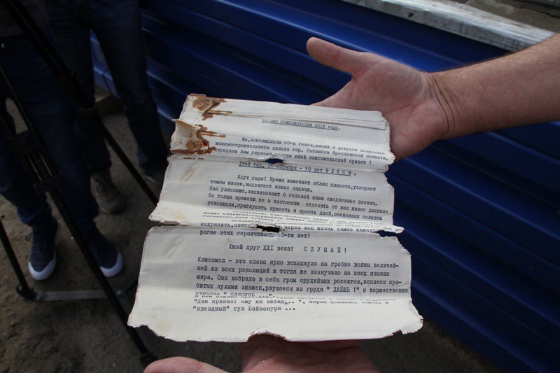 Письмо из капсулы написано молодыми людьми из Рыбинска. Ребята передали потомкам “горячий комсомольский привет”.