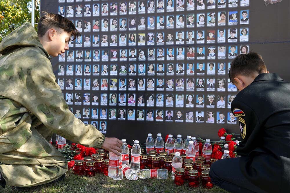 Участники акции почтили память жертв теракта минутой молчания. Затем возложили цветы, свечи и бутылки с водой, в которых так нуждались находившиеся в заложниках у террористов дети и взрослые.