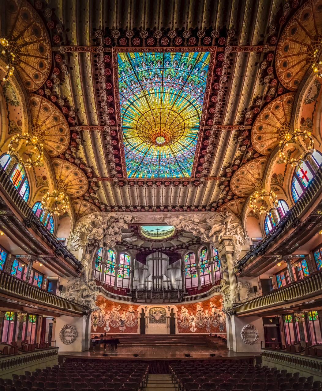 🌟Цей казковий концертний зал у стилі каталонського модерну, здається, зібрав абсолютно всю можливу декоративність: керамічні трояндочки та квіточки, фантастичних кольорів вітражі та центральний ліхтар, у вигляді перевернутого дзвону, ажурні ковані люстри, приголомшливе різьблення по каменю та мозаїка – багато мозаїки з битих керамічних плиток.