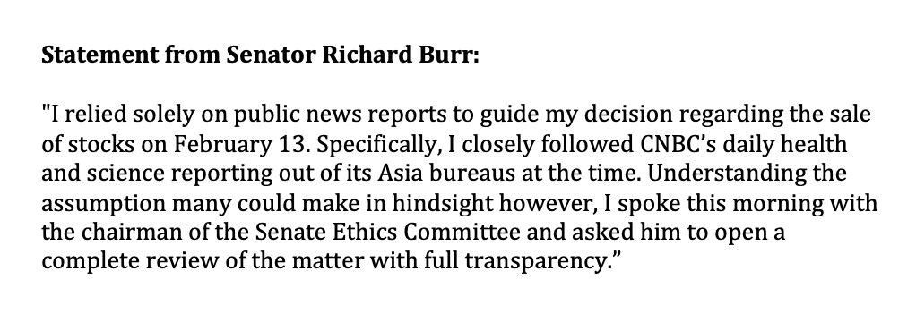 24 січня сенатори-республіканці Річард Берр (голова комітету з розвідки Сенату США) і Келлі Лофлер відвідали закритий брифінг для сенаторів з приводу коронавіруса, на якому провідні вчені пояснили ситуацію. Берр написав колонку для Fox News про те, наскільки добре країна готова. Самі Fox News щодня підкреслювали, що серйозність вірусу - це підступ демократів, щоб дискредитувати президента Трампа.