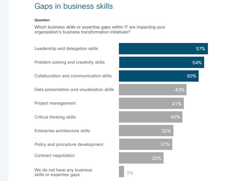 Компания Cisco выяснила каких навыков не хватает технарям. Они опросили топ-менеджеров компаний с годовой выручкой не менее $1 млрд.