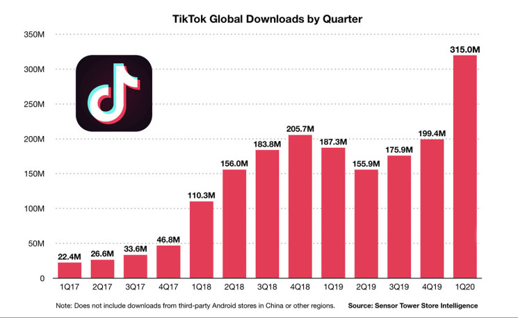 Конечно, такой резкий скачек связан с нынешней ситуацией. Согласно данным Sensor Tower, суммарно загрузки TikTok из App Store и Google Play выросли на 315 млн за в последнем квартале квартае.