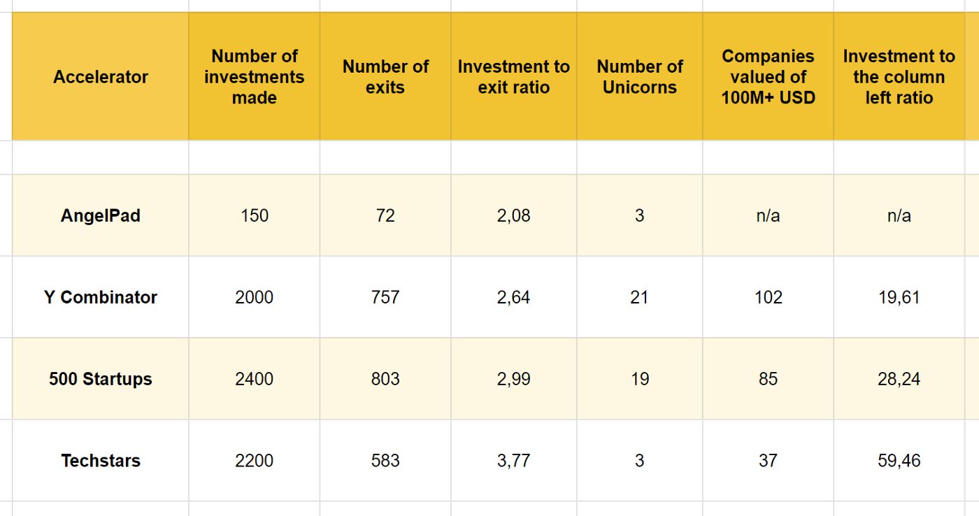 📌 У Techstars с AngelPad по 3 единорога на каждого.