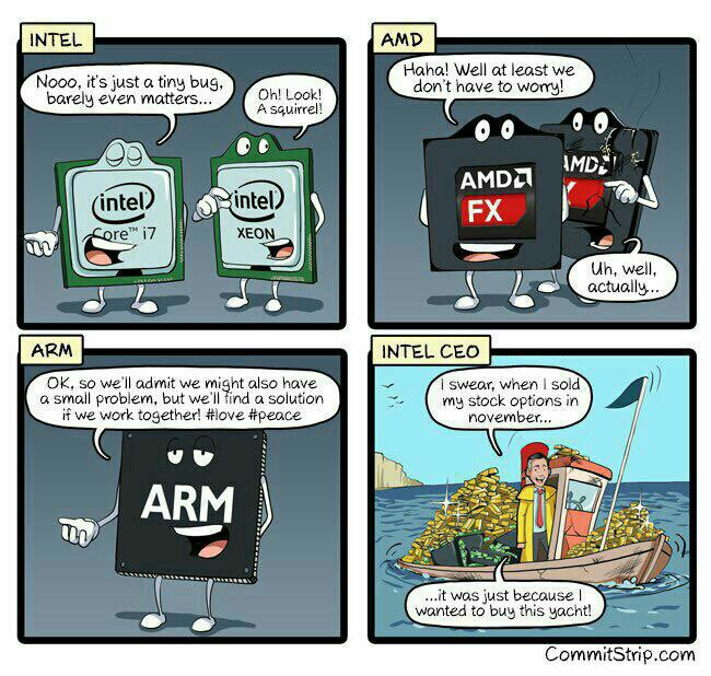 Вчерашний hole с процессорма обростает новыми подробностями. Во-первых, это серьезный аппаратный косяк, это значит, что затронуты вообще все вычислительные устройства: будь то сервера или смартфоны. Да, ARM тоже, но тут начинаются нюансы: