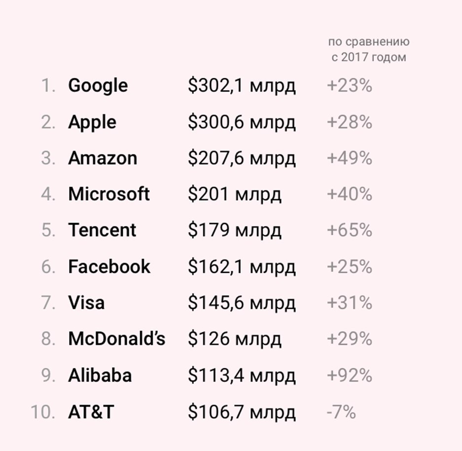 O‘tgan yilgi kabi bu yil ham ro‘yxatning birinchi o‘rnini Google band etdi. Brend 302,1 mlrd dollarga baholangan. Qiymati 300,6 mlrd dollar deb baholangan Apple ikkinchi o‘rinda. Yuqori uchlikni qiymati 207,6 mlrd dollarga yetgan Amazon egallagan.