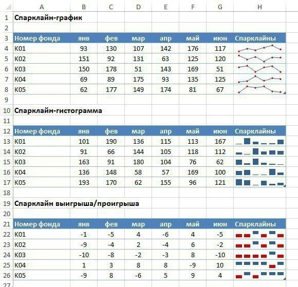 Menyu satrining Вставка varaqa (вкладка)sida Спарклайны tugmasi ustiga bosing va kerakli turini tanlang.