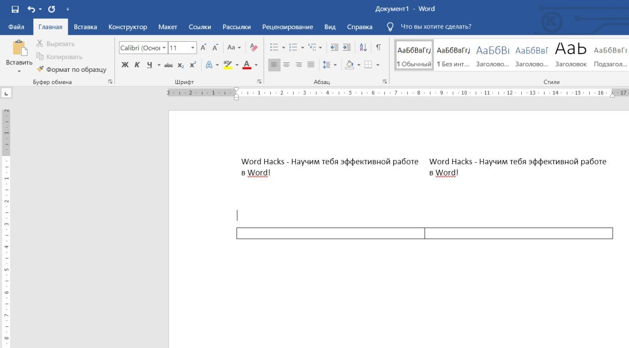 Jadvalning har ikki katagiga sizga kerakli bo‘lgan matnni kiriting. Umuman olganda, siz matningizni 2 qismga ajratuvchi ko‘rinmas jadvalni yaratgan bo‘lasiz.