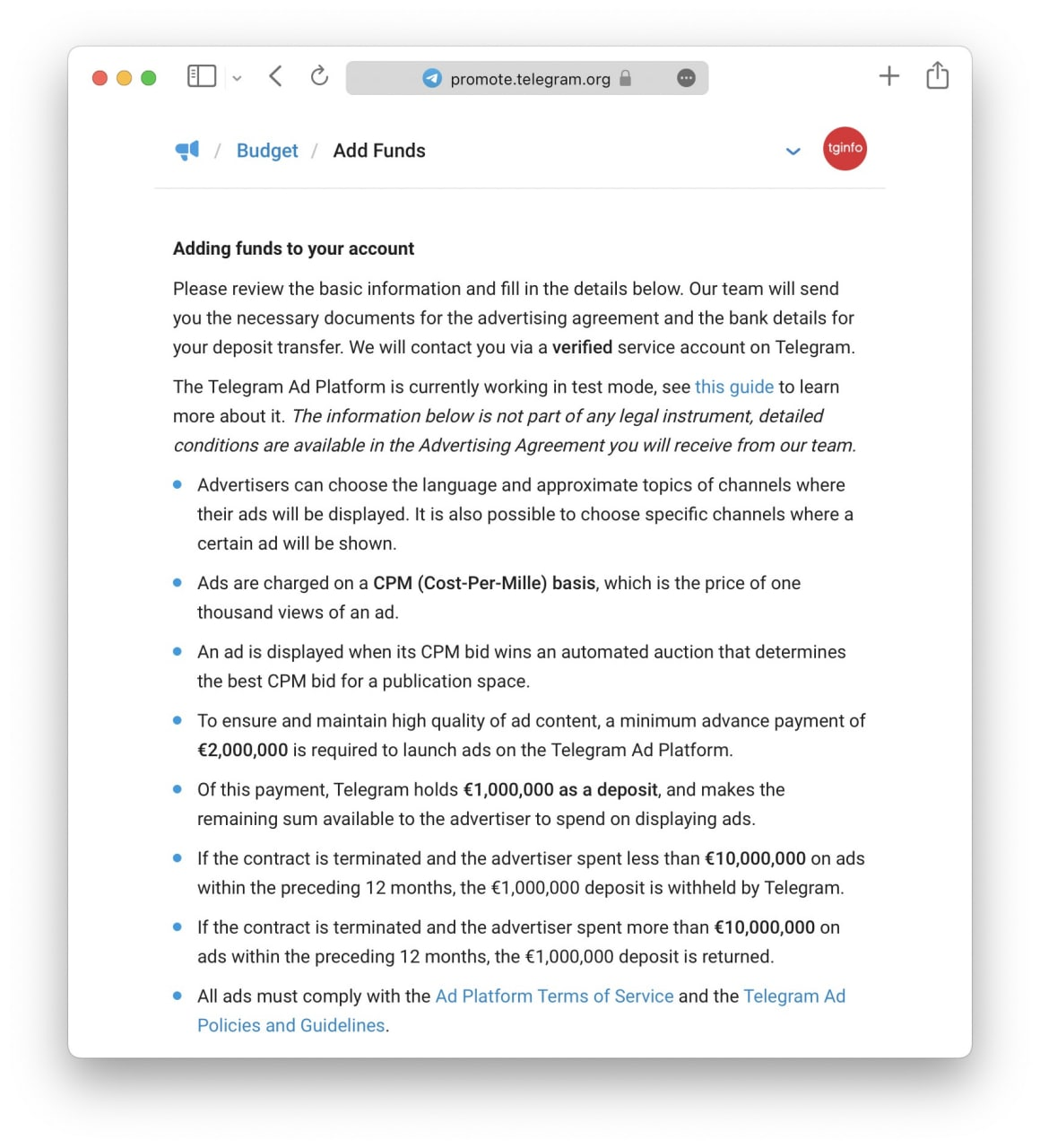 Agar shartnoma bekor qilinsa va reklama beruvchi o‘tgan 12 oy ichida reklama e’lonlari uchun 10 mln yevrodan kam mablag‘ sarflagan bo‘lsa, 1 mln yevrolik depozit Telegram tomonidan ushlab qolinadi.
