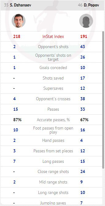 Если бы, не подводившее хозяев мастерство( удары в перекладину/мимо с метра в пустые) и ГЕРОЙСТВО Попова в воротах, счёт мог быть куда более жёстким, ведь согласно данным Instat хозяева создали моментов на 8 по xG (грубо говоря примерно 16 голов).