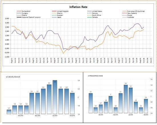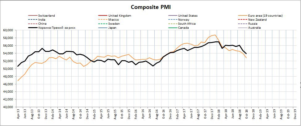 Темпы инфляции выросли, но за счет роста цен производителей, это при том, что в октябре цены на нефть падали. Любопытный сигнал оживления. Темпы роста по еврозоне (рыжая на картинке) выглядят трендово, нужно сворачивать QE, но глядя на деловой цикл в ЕС, это чревать рецессией, причем полноценной. Что будут делать в условиях ловушки ликвидности - неизвестно.