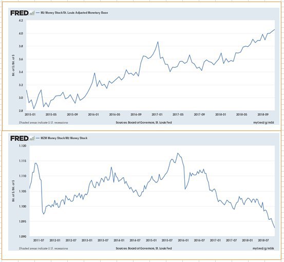 На прошлой неделе мультипликаторы денежного рынка продолжили сигнализировать об оживлении экономики, денежная масса М2 растет быстрее денежной базы, за счет рынка капитала и перетоком депозитов коммерческих банков из ФРС в экономику через кредитования. Все бы хорошо, но сама денежная база потеряла 20 млрд., показатель реальной денежной массы (скоректированной на инфляцию) за октябрь еще не вышел, но учитывая что инфляция в США выросла (широкая), то масса также потеряла в росте.
