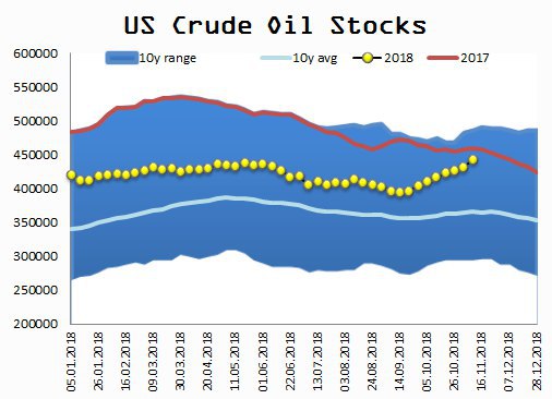 Нефть сейчас должна расти или дрейфовать вправо, по меньшей мере, до 27.11.18. В любом случае, без проявления слабости. Однако на дневной развертке проявляется явная нерешительность быков (или их слабости). И это плохо. Поскольку каждый день стоянки, пусть даже и в относительно немалом коридоре цен, снижает шансы на разворот вверх и увеличивает вероятность продолжения тренда вниз.