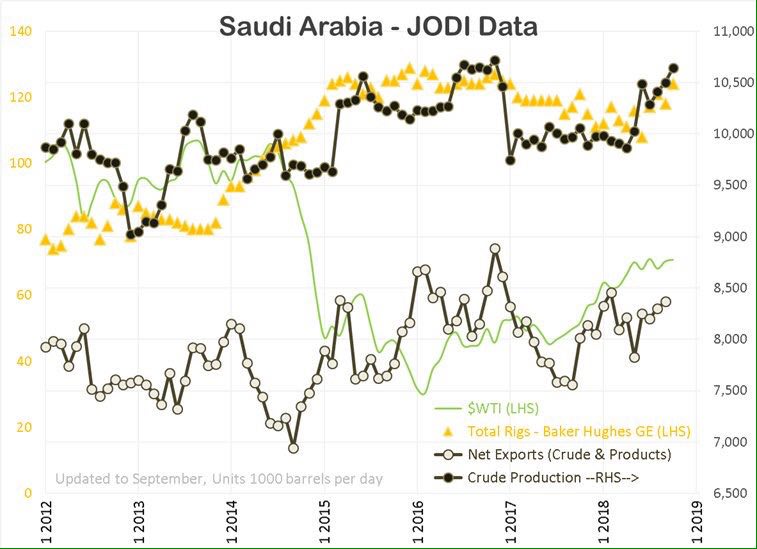 #нефть Саудовская Аравия. Хорошая подборка от JODI. КСА расширяет нефтедобычу, вышки, добыча, экспорт растут. При этом запасы нефти в королевстве падают, причём существенно. Для восстановления запасов нужно притормозить с экспортом, что и объявлено на заседании ОПЕК+, в декабре мировой рынок недополучит 500 тб/д.