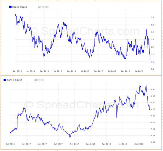 #экономика Все что нужно знать об ожиданиях роста ставок в 2019 году (ФРС) после заявления Пауэлла. Верхняя картинка годовой спред ставки Libor (декабрь 2018-декабрь2019), тут авральное снижение. т.е. рынок не ждет ужесточения политики ФРС. Нижняя - 7-ми месячный спред по ставки фондов (январь-сентябрь 2019 года), та же история, спред перевернулся, после двух лет роста. Ждем данные за текущую неделю в понедельник для расчета TED-спреда, думаю там снижение будет.