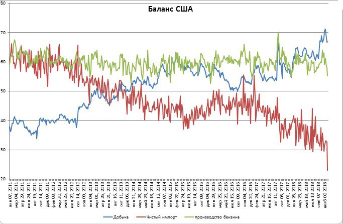 #нефть Сводки с полей ОПЕК приходят неутешительные, рассматривают сокращение не более чем на 1 мб\д, цены, соответсвенно, свалились, на пике спада было -5%. НО, пока там развозюкивают, имеем реализацию вот этой истории. На картинке: реализация сокращения экспорта в США, доля чистого импорта в балансе США упала до исторического минимума (на картинке этого нет, глубина данных с 2001 года). Как результат, запасы показали рекордное за два месяца сокращение. И это начинается тренд, по всей видимости спред брент\лайт будет сужаться, а это не на руку американским экспортерам. Которые, стоит заметить, вышли на рекорд по экспорту сырой нефти в 3,2 мб\д.