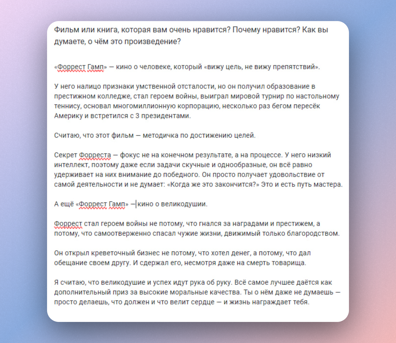 В анкете она просит назвать любимый фильм и объяснить, как ты его понимаешь и почему нравится именно он. Я выбрал «Форрест Гамп», потому что 🅰️ это культовое кино, которое все, — в том числе Людмила, ага, — знают и любят 🅱️ это история великодушного человека. Ну и потому, что я и вправду люблю этот фильм. Но в копирайтинге, — а отклик на вакансию ничем от него не отличается, — это вообще не важно.