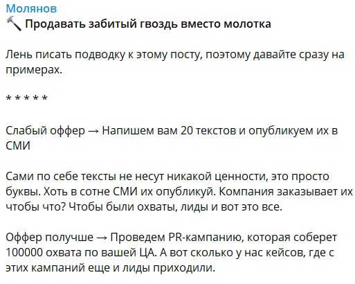 Этот пост мог быть хейтом Молянова. Но не будет. Короче, час назад он рассказал о языке выгод — практически правиле №1 в копирайтинге. Первое, чего хочется — поругать за «примитивность», «очевидность» и «поверхностность».
