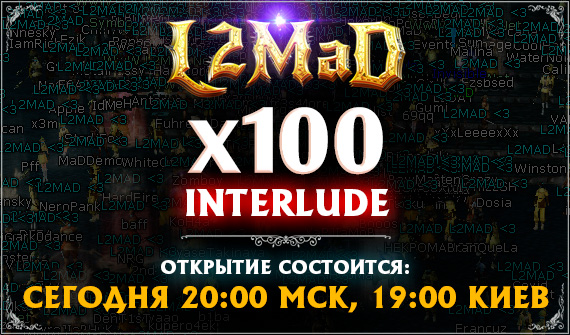 💥 Открытие L2MAD.NET Interlude MultiCraft x100 состоится уже сегодня! Огромный онлайн, множество кланов, фан за споты и боссов 24/7, большое обновление!