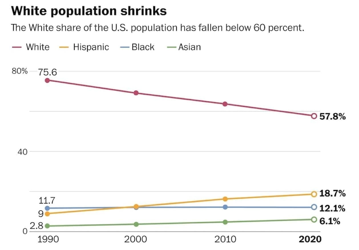 ͏Число белых в США сократилось впервые после первой переписи населения в 1990 году . Согласно данным переписи 2020 г., в США проживало около 191,7 млн белых, тогда как по данным предыдущей переписи 2010 г., их было 196,8 млн. Т.е. доля белого населения США снизилась за 10 лет с 63,7% до 57,3%.