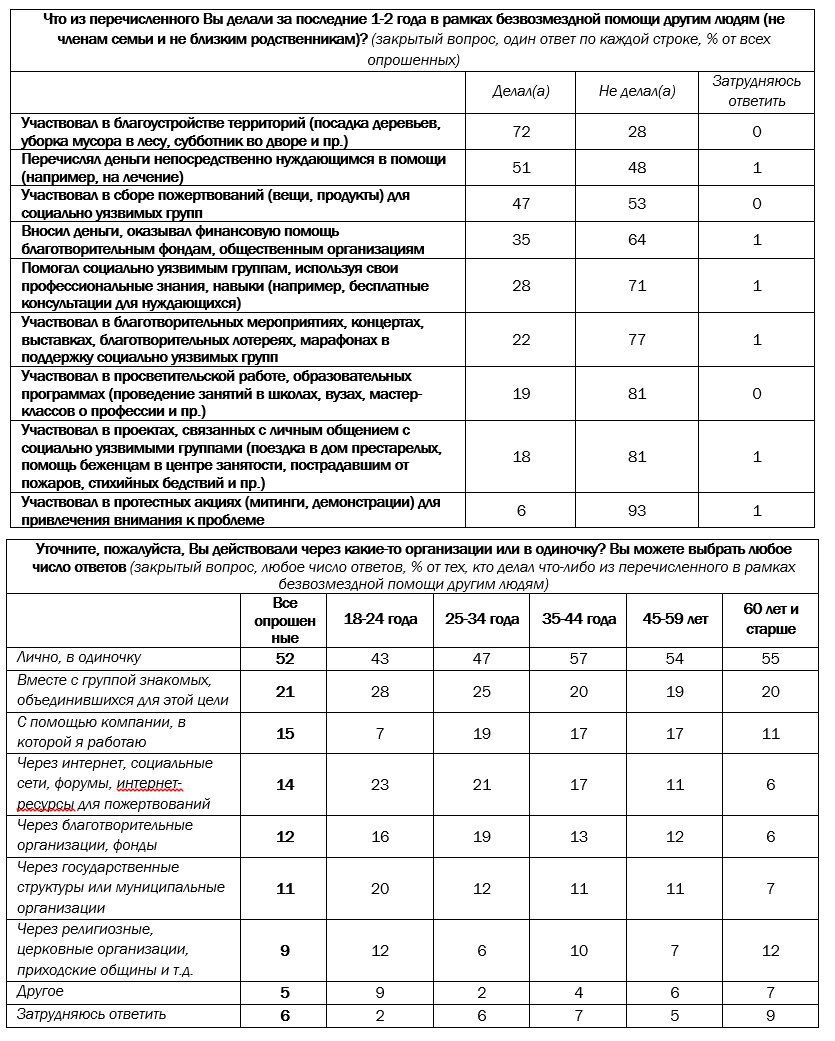 2018 год Указом Президента объявлен Годом добровольца (волонтёра). Наиболее распространенной формой волонтерской активности у россиян является участие в благоустройстве территорий – опыт такого рода деятельности есть у 72% респондентов. Около половины граждан перечисляли деньги нуждающимся в помощи (51%) и участвовали в сборе пожертвований (47%).