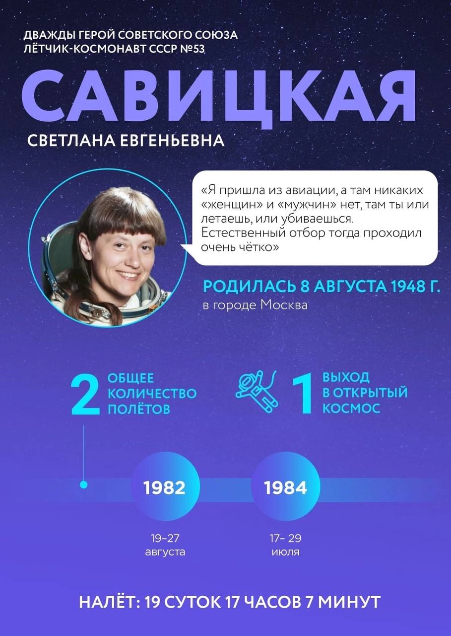 🚀 Сегодня день рождения празднует дважды Герой Советского Союза, лётчик-космонавт СССР № 53 Светлана Евгеньевна Савицкая!
