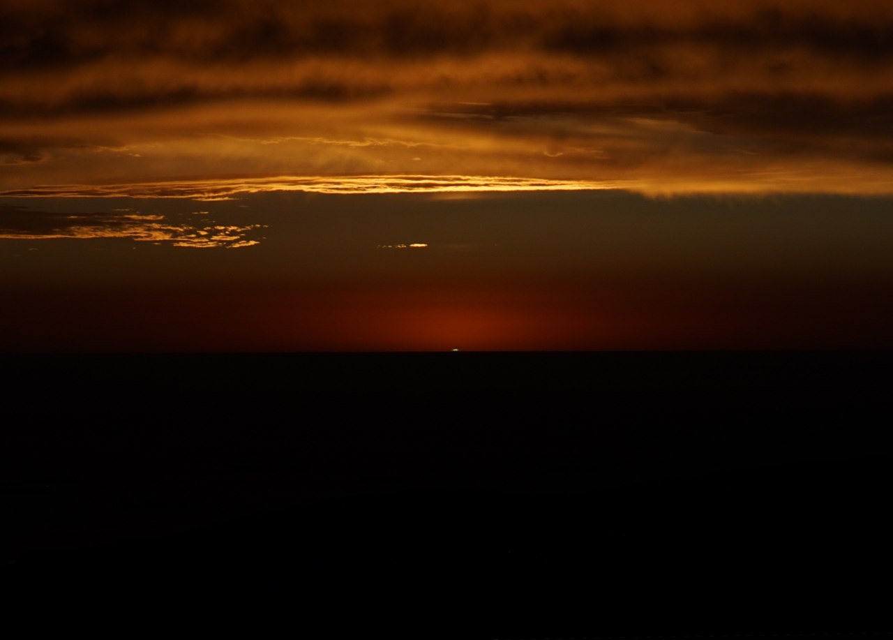Если внимательно вглядеться в Солнце на этом фото, то можно увидеть, что оно зеленое. Зелёный луч — оптическое явление, вспышка зелёного света в момент исчезновения солнечного диска за горизонтом (обычно морским) или появления его из-за горизонта. Его длительность обычно не более 1-2 секунд.