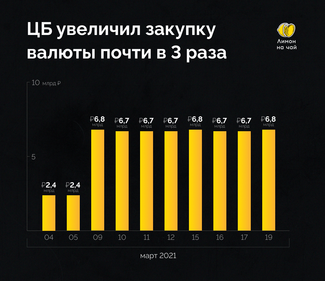 Центробанк на прошлой неделе резко увеличил закупку валютой. Если 5 марта он покупал валюту по ₽2,4 млрд в день, то начиная с 9 марта — по ₽6,7 млрд в день (+179%).