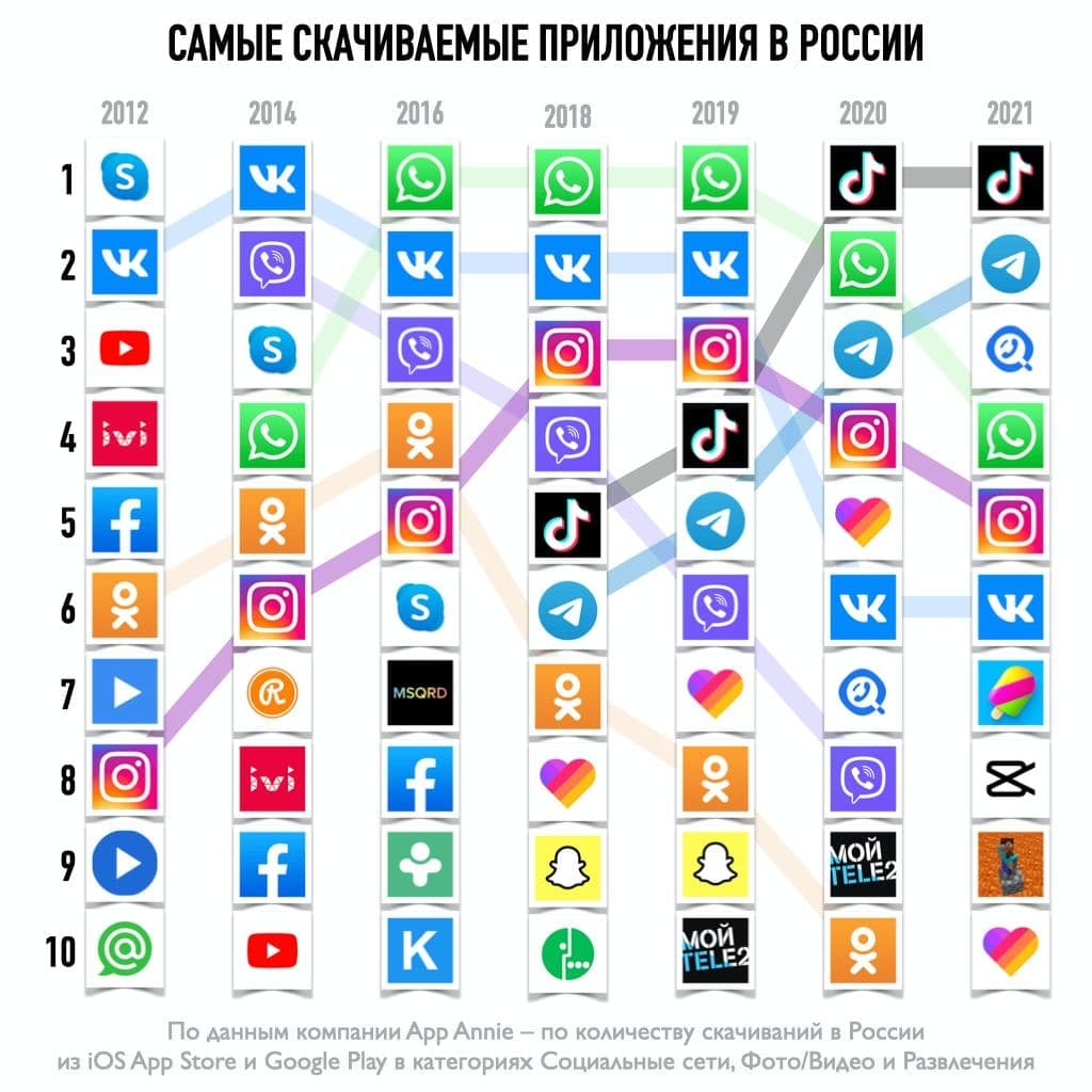 Интересно проследить взлет Instagram и TikTok. Telegram вряд ли обгонит TikTok, но в ближайшие годы точно будет в ТОП. ВКонтакте уже вне первой пятерки (это и не удивительно). Вацап традиционно в лидерах. И куда делся Scype?))