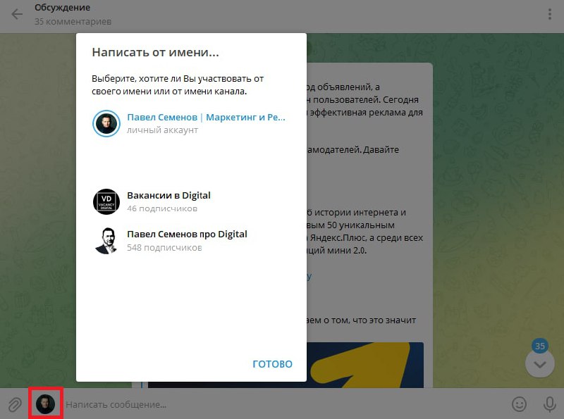 Чтобы появилась такая возможность, нужно обновить мессенджер. Для того, чтобы оставить комментарий от имени одной из своих групп, нужно выбрать его слева внизу от поля ввода (см. скрин).