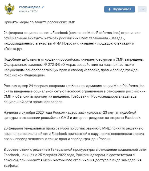 С 25 февраля 2022 года Роскомнадзор начал применять меры частичного ограничения доступа к социальной сети Facebook в виде замедления трафика. По этой причине Facebook, Instagram, Twitter на территории РФ работают с перебоями и затруднениями. С 28 февраля начались перебои в рекламе Google Ads - реклама идет, но при клике появляется ошибка.