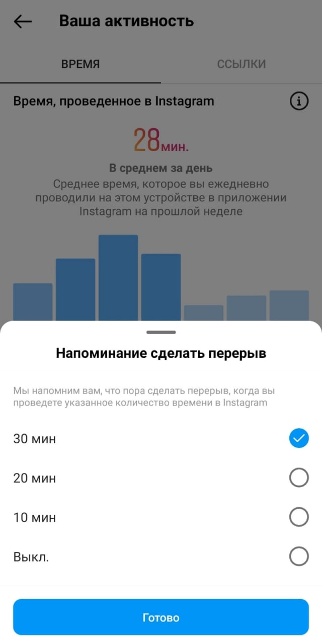 Интересная и полезная функция, но чтобы отключить напоминание об отдыхе, пользователю даже не придется выходить из приложения. Достаточно нажать на кнопку «Готово» и можно дальше бороздить просторы соцсети. Поэтому напоминание поставить можно, но удерживать себя от соблазна еще немного посмотреть ленту, все же придется самим.