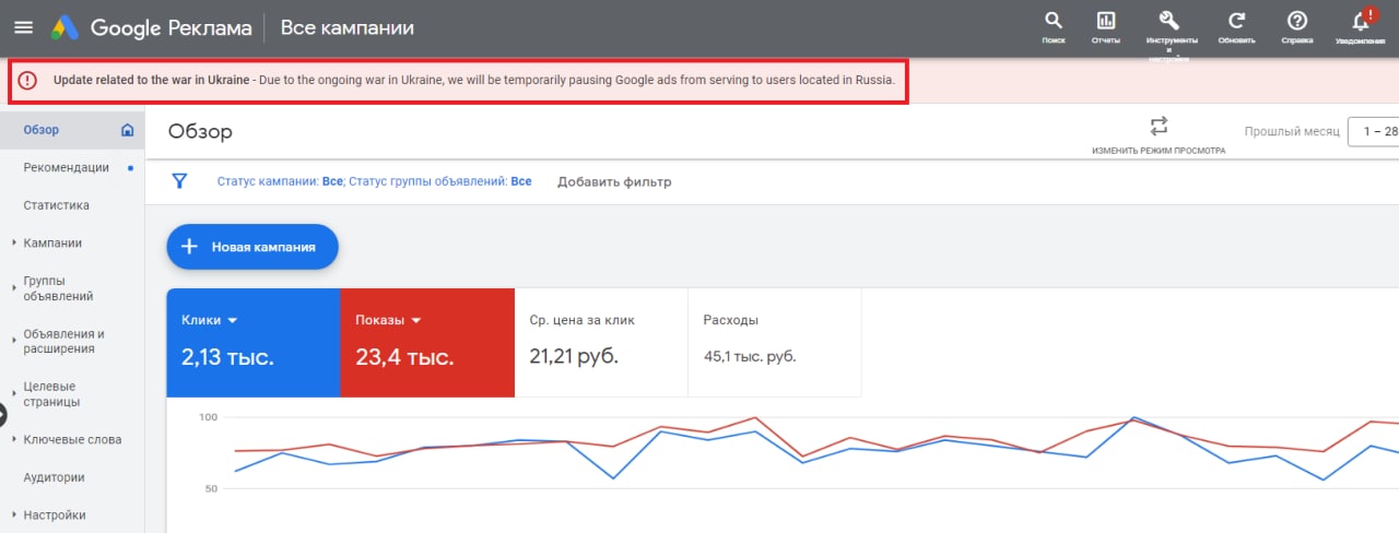 Реклама недоступна как в поиске, так и в YouTube и партнёрских сетях. Соответствующее уведомление также появилось и в рекламном кабинете.
