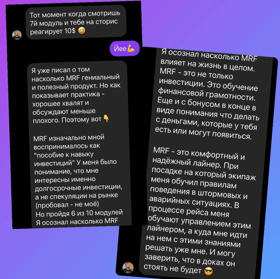 На днях получил очередной отзыв от ученицы с первого потока. Она оценила то, как информация в MRF лаконично «ложиться в мозг» и легко воспринимается, по сравнению с другими обучающими курсами (скрин ее сообщения в карусели фото).