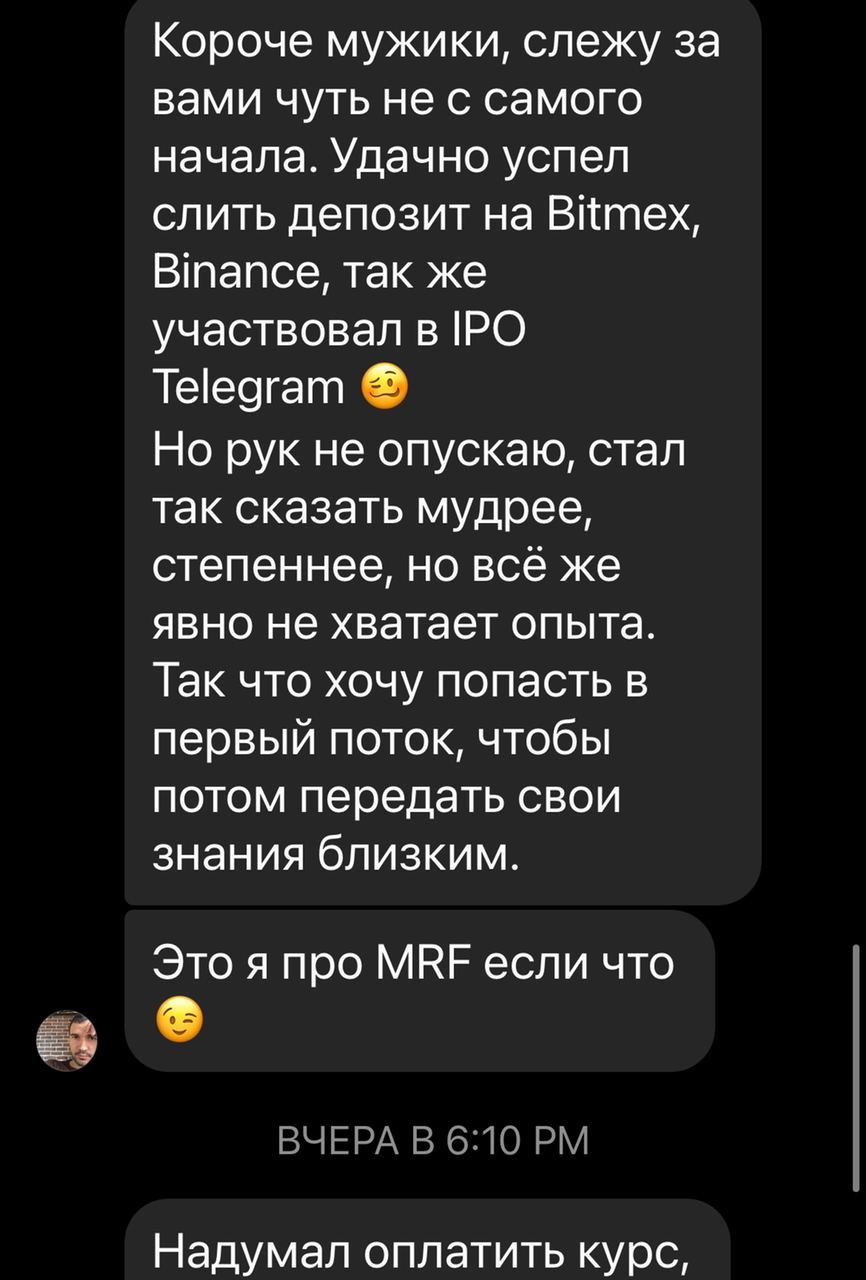 «Долгое время следил за проектом 10 долларов Баффетта, участвовал в трёх ICO клубах и в ICO Telegram. За это время сформировалось хорошее доверие к вашей команде, так что записался на обучение особо не разбираясь. Знаю, что если вы берётесь за такой проект, то это будет качественно. Я на протяжение последних 6 месяцев активно занимался трейдингом со своей командой.