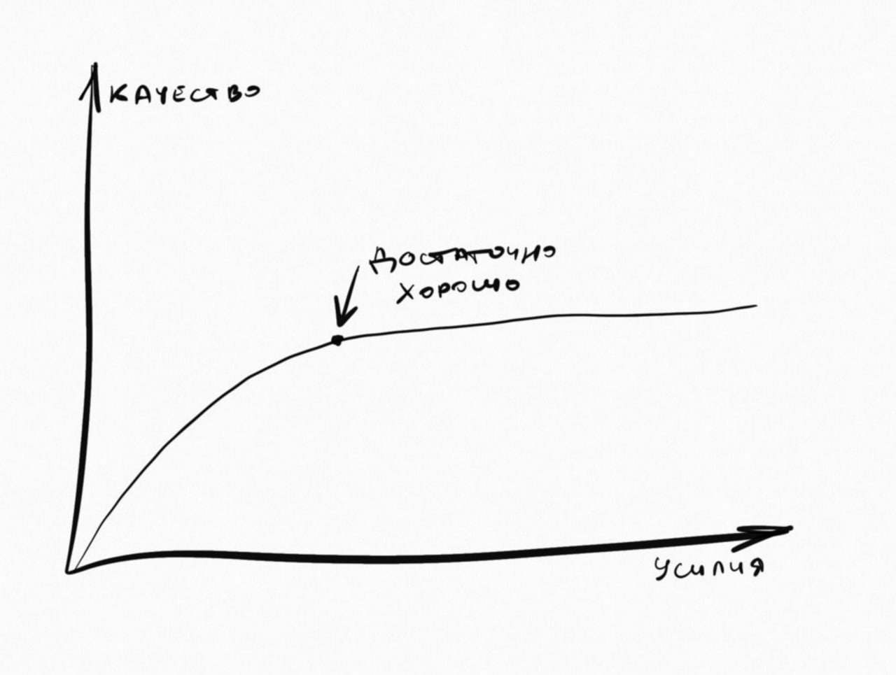 Если представить принцип «достаточно хорошо» на графике с осями усилий и качества, получится кривая с точкой на ней, после которой линия становится почти параллельной оси усилий. То есть дальше можно, но не нужно. Хватит. Уже достаточно хорошо.