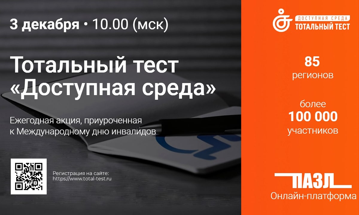 📌 3 декабря 2021 года в 10:00 состоится Тотальный тест «Доступная среда» – ежегодная общероссийская акция, приуроченная к Международному дню инвалидов.