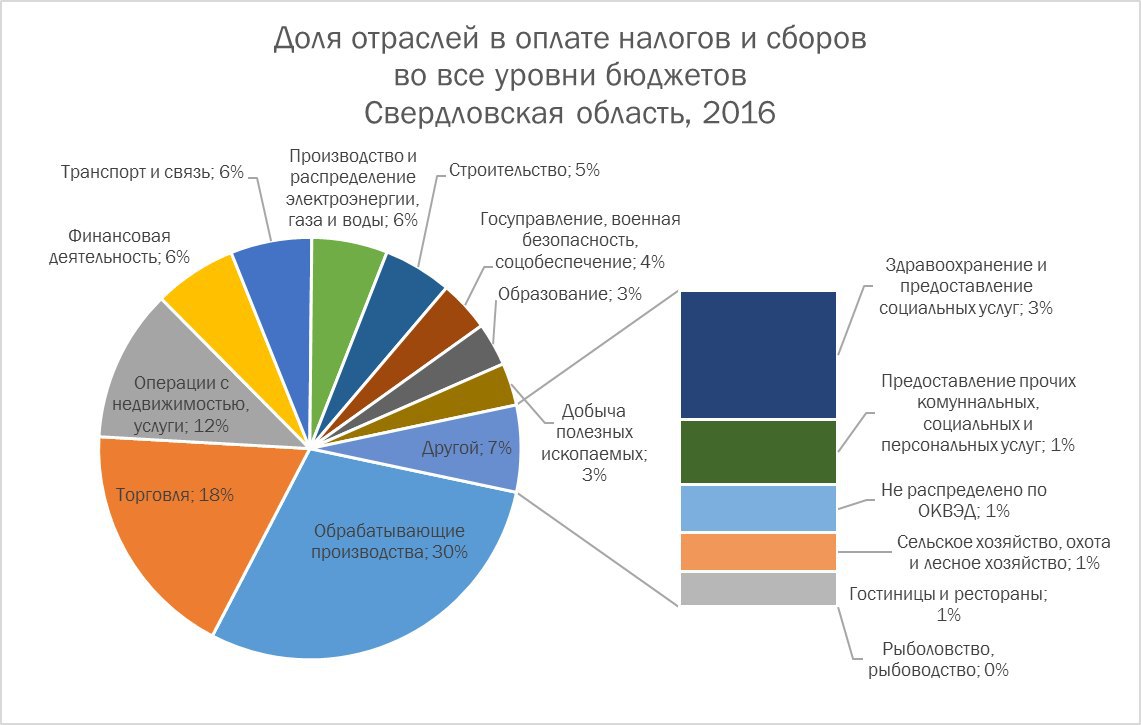 Вклад обрабатывающей промышленности - 44%, заметно большая доля, чем у северных соседей. Дальше идет торговля и операции с недвижимостью, их доли сопоставимы, но если в Свердловской области они вместе дают 30% налогов, то в Челябинской области - 21%.
