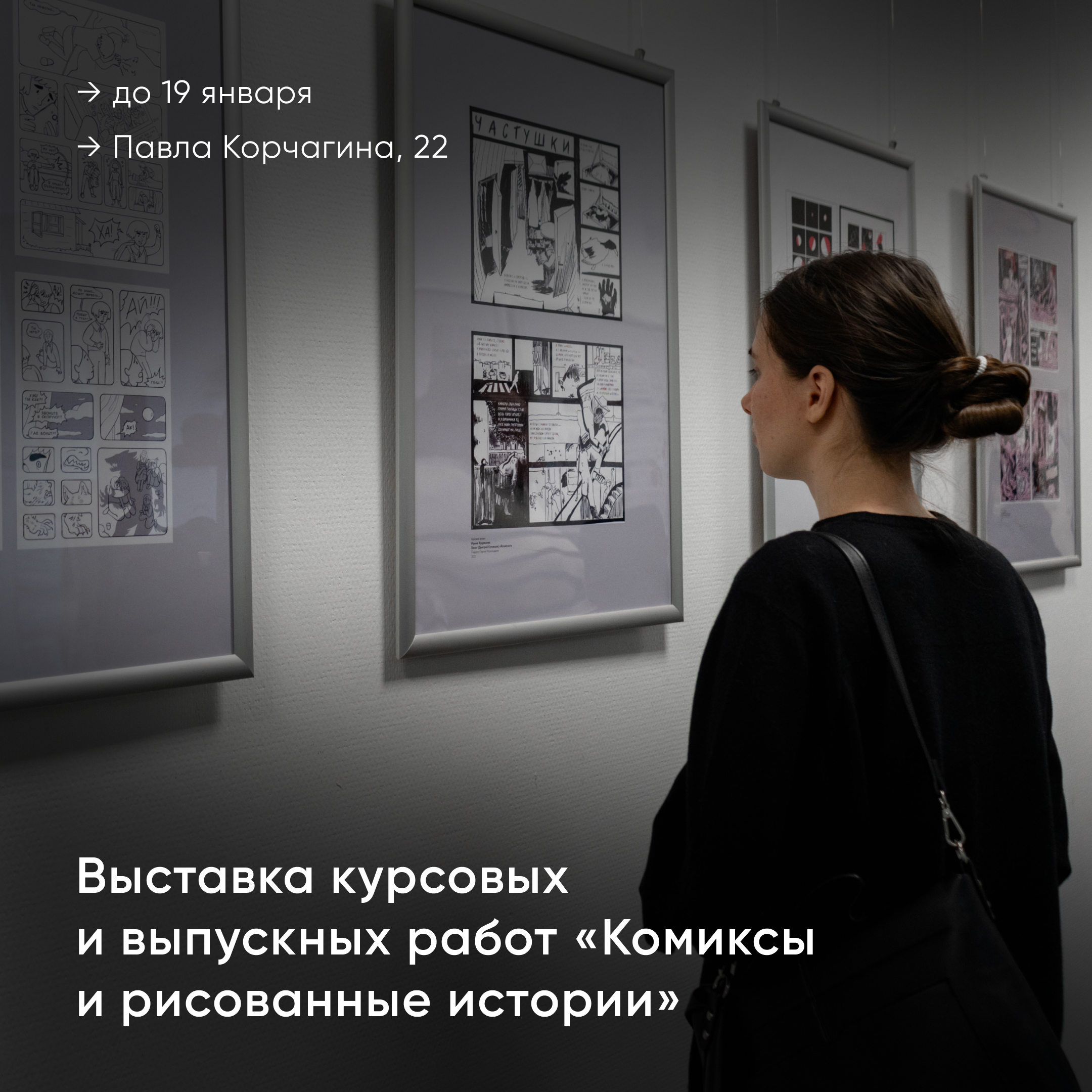 В корпусе на Павла Корчагина, 22 проходит выставка «Комиксы и рисованные истории». Экспонаты мероприятие — реальные работы студентов кафедры «Иллюстрация и эстамп» Института графики и искусства книги имени В.А. Фаворского.