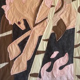Носферату, он же Дракула — культурный феномен, который больше ста лет переосмысляется во всех возможных формах искусства. На пути от румынских мифов он трансформировался в Дракулу Брема Стокера, персонажа Улицы Сезам и Эдварда Каллена, и, кажется, не перестал вдохновлять авторов и вызывать интерес к своей персоне. Этот ковер посвящен первому сохранившемуся полнометражному фильму 1922 года — «Носферату. Симфония ужаса» Фридриха Мурнау. Зеленоватая ограниченная палитра подражает эффекту старой монохромной пленки, а темный портал позади фигуры обозначает то ли дверь, то ли гроб для дневного сна. Светлая ткань на руках и ушах растрепалась как редкие волосы и добавила графу реализма и зловещести.