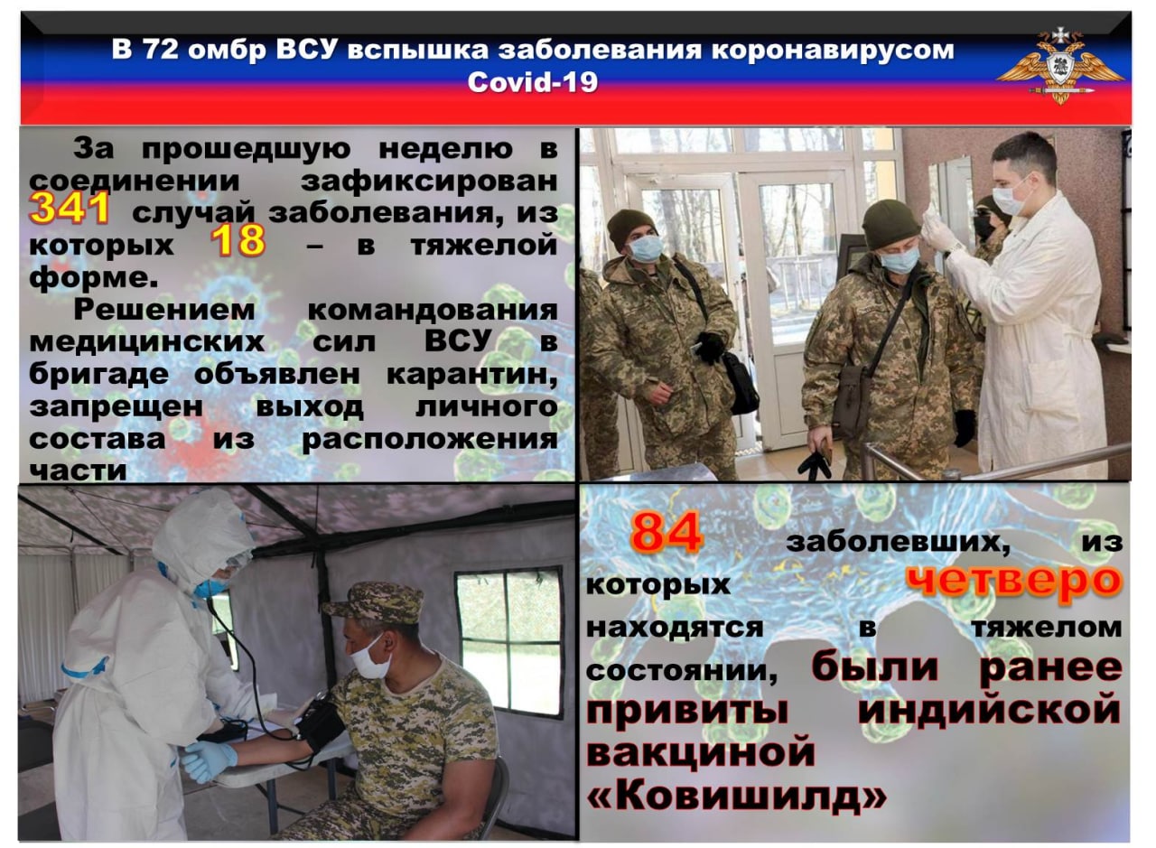 ❗️За прошедшую неделю в соединении зафиксирован 341 случай заболевания, из которых 18 – в тяжелой форме. Решением командования медицинских сил ВСУ в бригаде объявлен карантин, запрещен выход личного состава из расположения части.