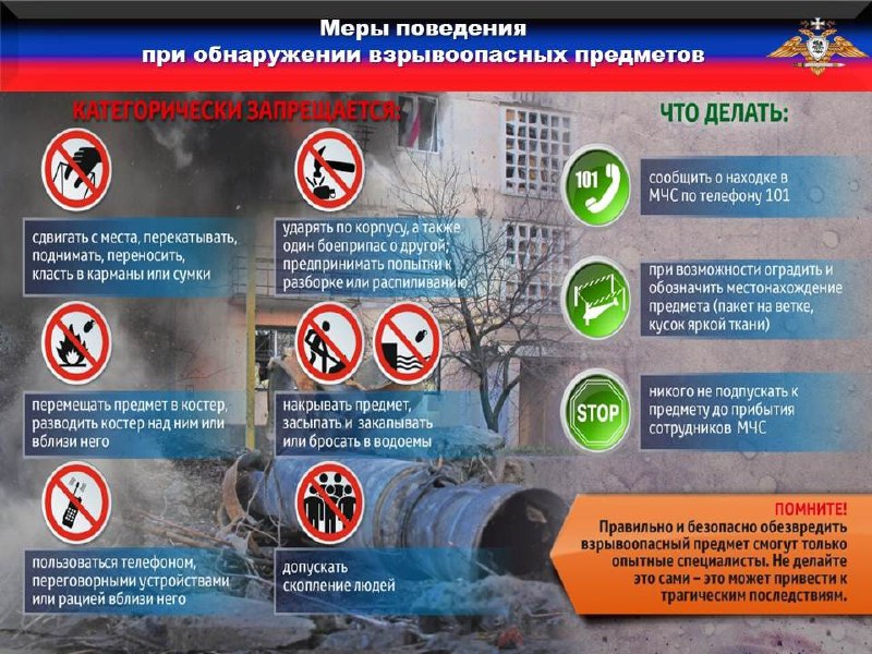 ❗️Призываем жителей Республики на фоне увеличивающихся обстрелов со стороны Украины, а также возможных диверсий различного типа со стороны Украины, с особой тщательностью соблюдать требования минной безопасности. При обнаружении подозрительных предметов не прикасаться к ним и немедленно сообщать об опасных находках в правоохранительные органы
