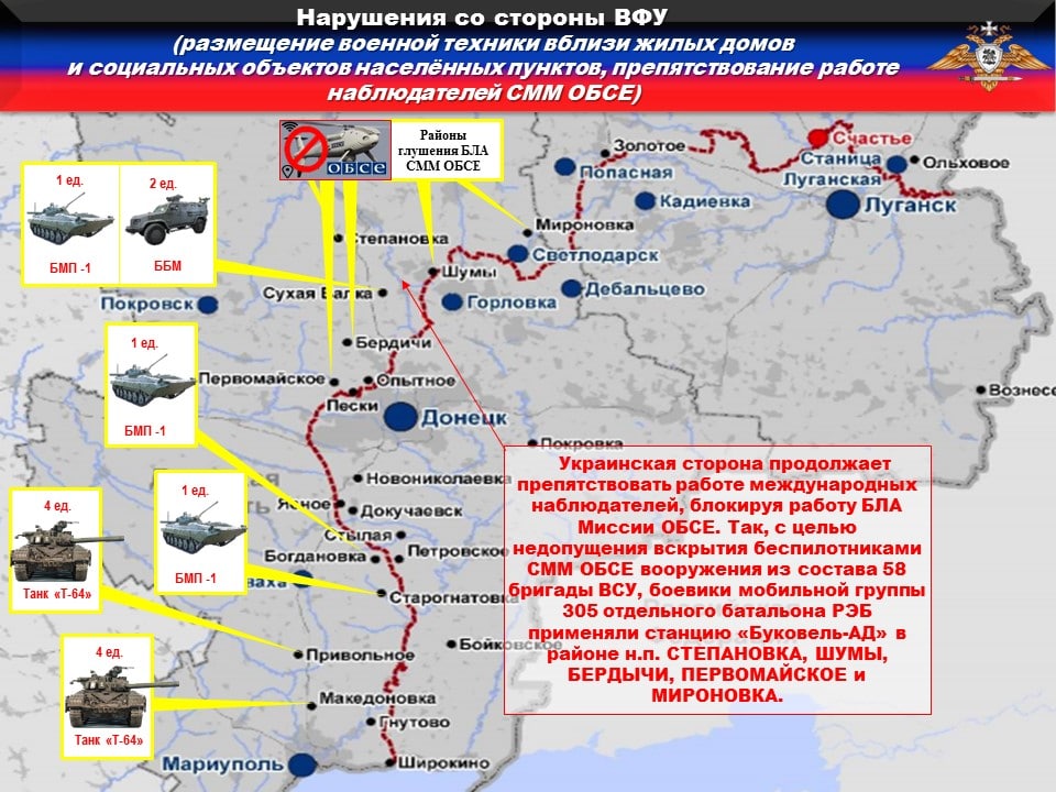 Украинская сторона продолжает препятствовать работе международных наблюдателей блокируя работу БЛА Миссии ОБСЕ. Так, с целью недопущения вскрытия беспилотниками СММ ОБСЕ вооружения из состава 10, 36, 58 и 59 бригад ВСУ, боевики мобильной группы 305 отдельного батальона РЭБ применяли станцию «Буковель-АД» в районе н.п. СТЕПАНОВКА, ШУМЫ, ПРИВОЛЬНОЕ, БЕРДЫЧИ, ПЕРВОМАЙСКОЕ и МИРОНОВКА.