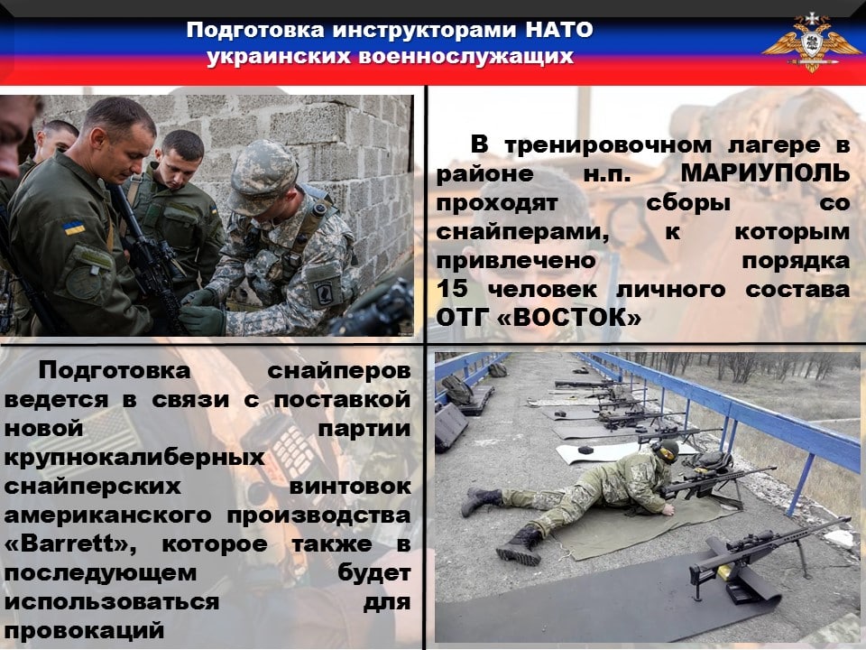 🔹Так, в тренировочном лагере в районе н.п. МАРИУПОЛЬ проходят сборы со снайперами, к которым привлечено порядка 15 человек личного состава ОТГ «ВОСТОК». Мы не исключаем, что подготовка снайперов ведется в связи с поставкой новой партии крупнокалиберных снайперских винтовок американского производства «Barrett», которое также в последующем будет использоваться для провокаций.