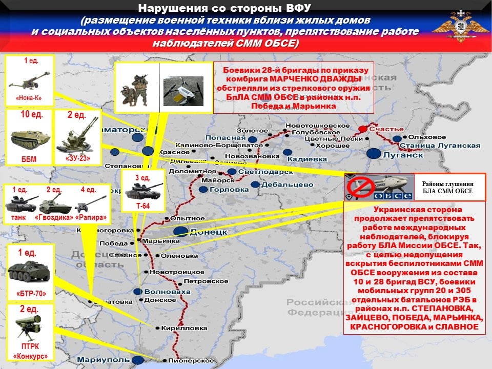 ♦️Украинская сторона продолжает активно препятствовать работе международных наблюдателей, блокируя работу БЛА Миссии ОБСЕ. Так, с целью недопущения вскрытия беспилотниками СММ ОБСЕ вооружения из состава 10 и 28 бригад ВСУ, боевики мобильных групп 20 и 305 отдельных батальонов РЭБ применяли станцию «Буковель-АД» в районах н.п. СТЕПАНОВКА, ЗАЙЦЕВО, ПОБЕДА, МАРЬИНКА, КРАСНОГОРОВКА и СЛАВНОЕ.