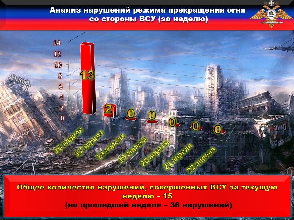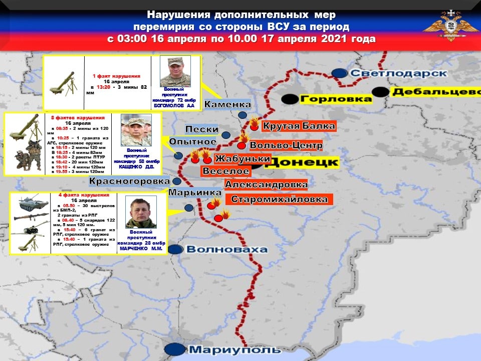 💥За прошедшие сутки с 16 на 17 апреля противник совершил ТРИНАДЦАТЬ огневых провокаций, в нарушение ВТОРОГО пункта комплекса дополнительных мер по усилению и контролю действующего режима прекращения огня.
