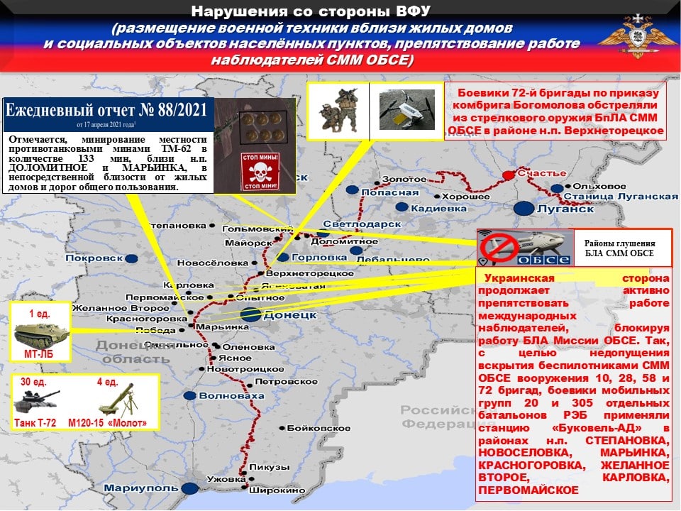 ⛔️Украинская сторона продолжает активно препятствовать работе международных наблюдателей, блокируя работу БЛА Миссии ОБСЕ. Так, с целью недопущения вскрытия беспилотниками СММ ОБСЕ вооружения из состава 10, 28, 58 и 72 бригад ВСУ, боевики мобильных групп 20 и 305 отдельных батальонов РЭБ применяли станцию «Буковель-АД» в районах н.п. СТЕПАНОВКА, НОВОСЕЛОВКА, МАРЬИНКА, КРАСНОГОРОВКА, ЖЕЛАННОЕ ВТОРОЕ, КАРЛОВКА, ПЕРВОМАЙСКОЕ.