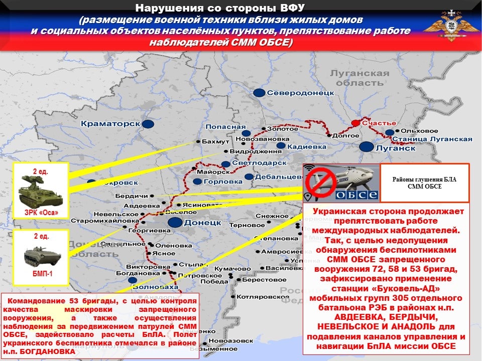 ♦️Украинская сторона продолжает препятствовать работе международных наблюдателей. Так, с целью недопущения обнаружения беспилотниками СММ ОБСЕ запрещенного вооружения 10 и 28 бригад, зафиксировано применение станции «Буковель-АД» двух мобильных групп 20 и 305 отдельных батальонов РЭБ в районе н.п. МАРЬИНКА и ЛУГАНСКОЕ для подавления каналов управления и навигации БпЛА миссии ОБСЕ.