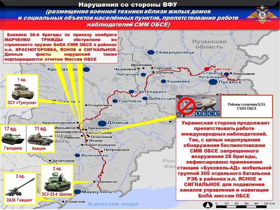 ⛔️Украинская сторона продолжает препятствовать работе международных наблюдателей. Так, с целью недопущения обнаружения беспилотниками СММ ОБСЕ запрещенного вооружения 28 бригады, зафиксировано применение станции «Буковель-АД» мобильной группой 305 отдельного батальона РЭБ в районах н.п. ЯСНОЕ и СИГНАЛЬНОЕ для подавления каналов управления и навигации БпЛА миссии ОБСЕ.
