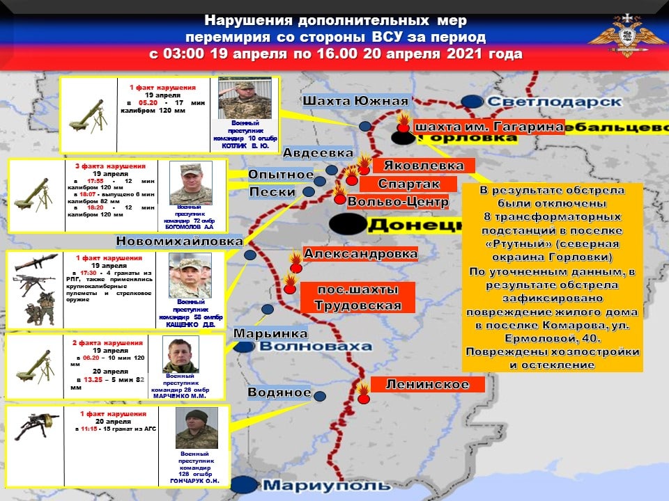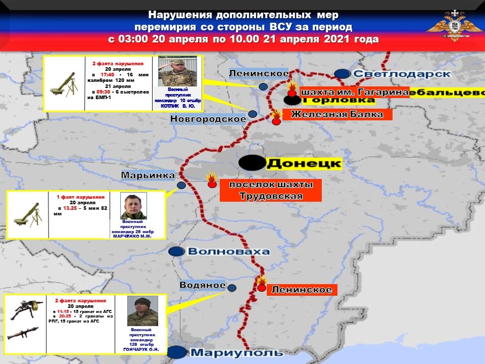 💥За прошедшие сутки с 20 на 21 апреля зафиксировано ЧЕТЫРЕ нарушения режима прекращения огня со стороны украинских боевиков.