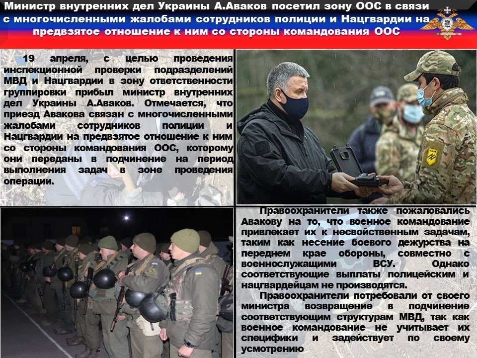 🦇По информации нашего источника в штабе ОТГ «Восток», 19 апреля, с целью проведения инспекционной проверки подразделений МВД и Нацгвардии в зону ответственности группировки прибыл министр внутренних дел Украины А.Аваков. Отмечается, что приезд Авакова связан с многочисленными жалобами сотрудников полиции и Нацгвардии на предвзятое отношение к ним со стороны командования ООС, которому они переданы в подчинение на период выполнения задач в зоне проведения операции.